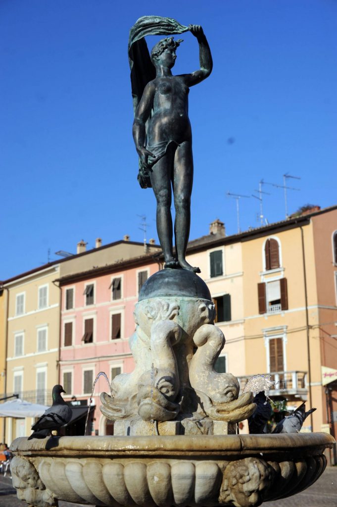 La graziosa statuetta bronzea della Dea Fortuna è una copia fedele dell’originale (oggi presso il Museo Civico) modellato e fuso nel 1593 dall’urbinate Donnino Ambrosi per abbellire il primitivo bacino ottagonale della vecchia fontana realizzata nel 1576. È considerata simbolo civico e richiama nella sua manieristica eleganza modelli scultorei giambologneschi.