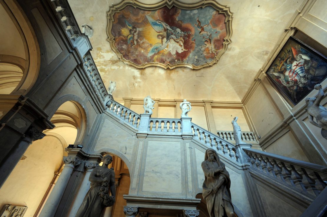 L’ambiente più spettacolare resta peraltro il grande scalone con quel suo ascendere scenografico a larghi gradini, tutto scorci e prospettive, nicchie, colonne e pilastri nella prima parte; aperto e disteso nel luminoso vano a volta della seconda parte, arricchita dalla schiera ascendente delle otto statue marmoree che pausano e impreziosiscono l’elegante balaustra a pilastrini.