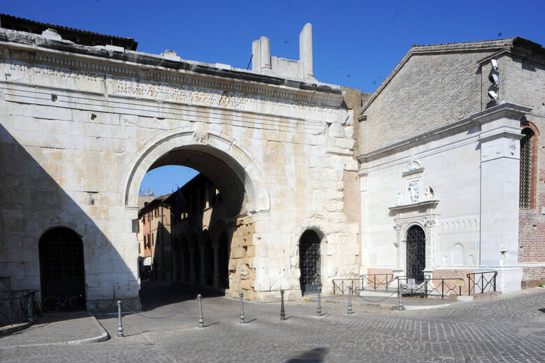 La visita alla Fano Romana non può che iniziare dall’Arco d’Augusto. Da sempre simbolo della città di Fano, fu in epoca romana la principale porta d’accesso alla Colonia Julia Fanestris, dedotta dall’Imperatore Augusto sul sito di un abitato sviluppatosi attorno al repubblicano Fanum Fortunae (tempio dedicato alla Dea Fortuna). Costruito sul punto in cui la Via Flaminia si innesta nel Decumano Massimo della città, il monumento si data, tramite l’iscrizione del fregio, al 9 d.C.rnrnRealizzata esternamente in blocchi squadrati di pietra calcarea proveniente da cave del Monte Nerone, la Porta si articola in due fornici laterali minori e un fornice centrale maggiore: la chiave di volta di quest’ultimo è decorata con una rappresentazione di animale oggi non più riconoscibile.rnLe pietre provenienti dall’attico, demolito dal Duca di Urbino Federico da Montefeltro nel 1463, furono reimpiegate nella costruzione della adiacente chiesa di San Michele.